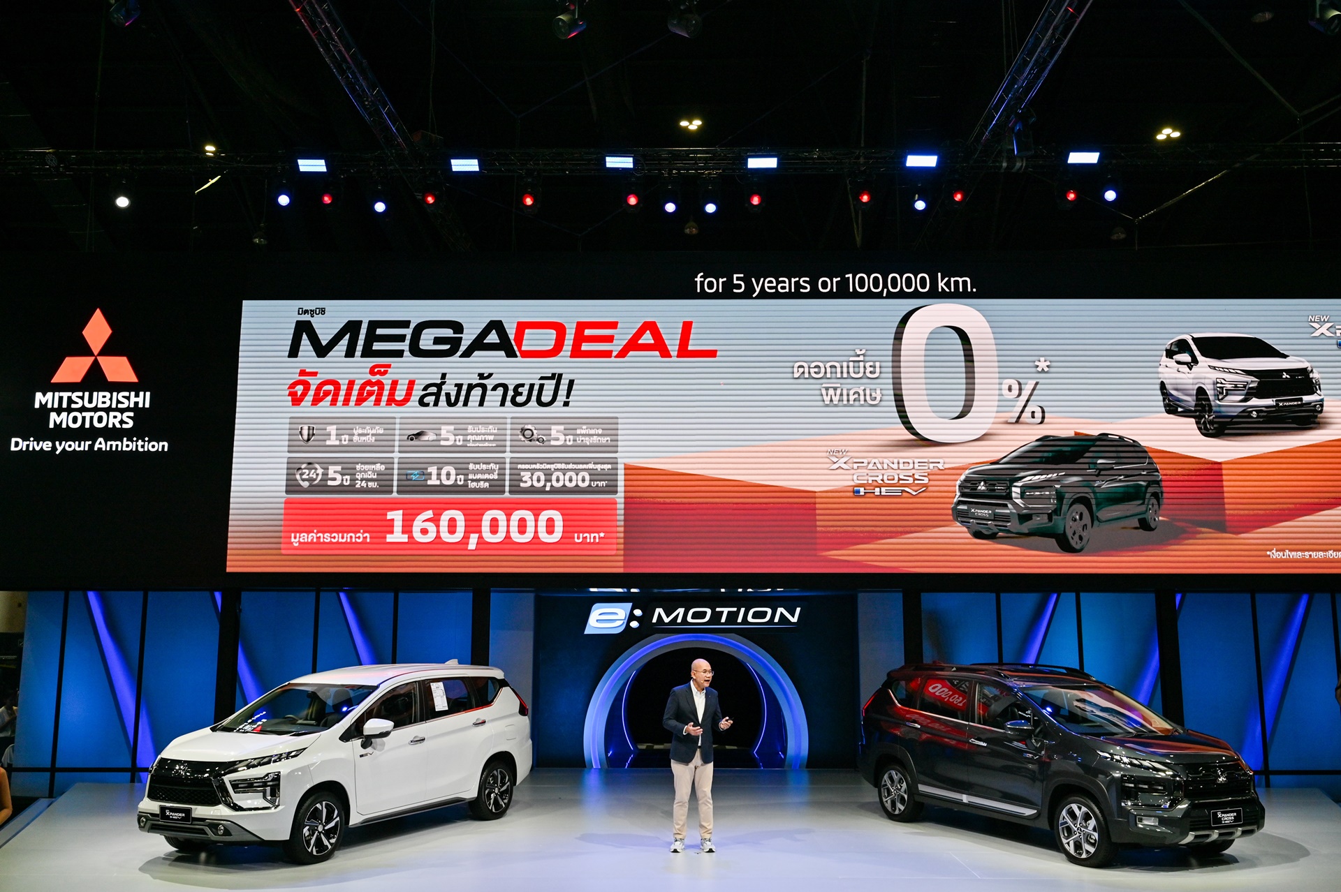 บริษัท มิตซูบิชิ มอเตอร์ส (ประเทศไทย) จำกัด ชวนลูกค้าร่วมสัมผัสประสบการณ์ MITSUBISHI e:MOTION พร้อมขนทัพสุดยอดยนตรกรรมล้ำสมัย นำโดย มิตซูบิชิ เอ็กซ์แพนเดอร์ เอชอีวี และ มิตซูบิชิ เอ็กซ์แพนเดอร์ ครอส เอชอีวี ร่วมด้วย มิตซูบิชิ ปาเจโร สปอร์ต รุ่นปี 2024 รุ่นขับเคลื่อน 4 ล้อ อีลีท เอดิชัน มิตซูบิชิ ไทรทัน แอทลีท มิตซูบิชิ ไทรทัน แบล็ก เอดิชัน มิตซูบิชิ แอททราจ สมาร์ท และ มิตซูบิชิ มิราจ สมาร์ท ด้วยข้อเสนอพิเศษกับแคมเปญ ‘MEGA DEAL’ โปรโมชั่นสุดยิ่งใหญ่จัดเต็มส่งท้ายปี รับข้อเสนอมูลค่ารวมสูงสุด 160,000 บาท ณ งานมหกรรมยานยนต์ ครั้งที่ 41