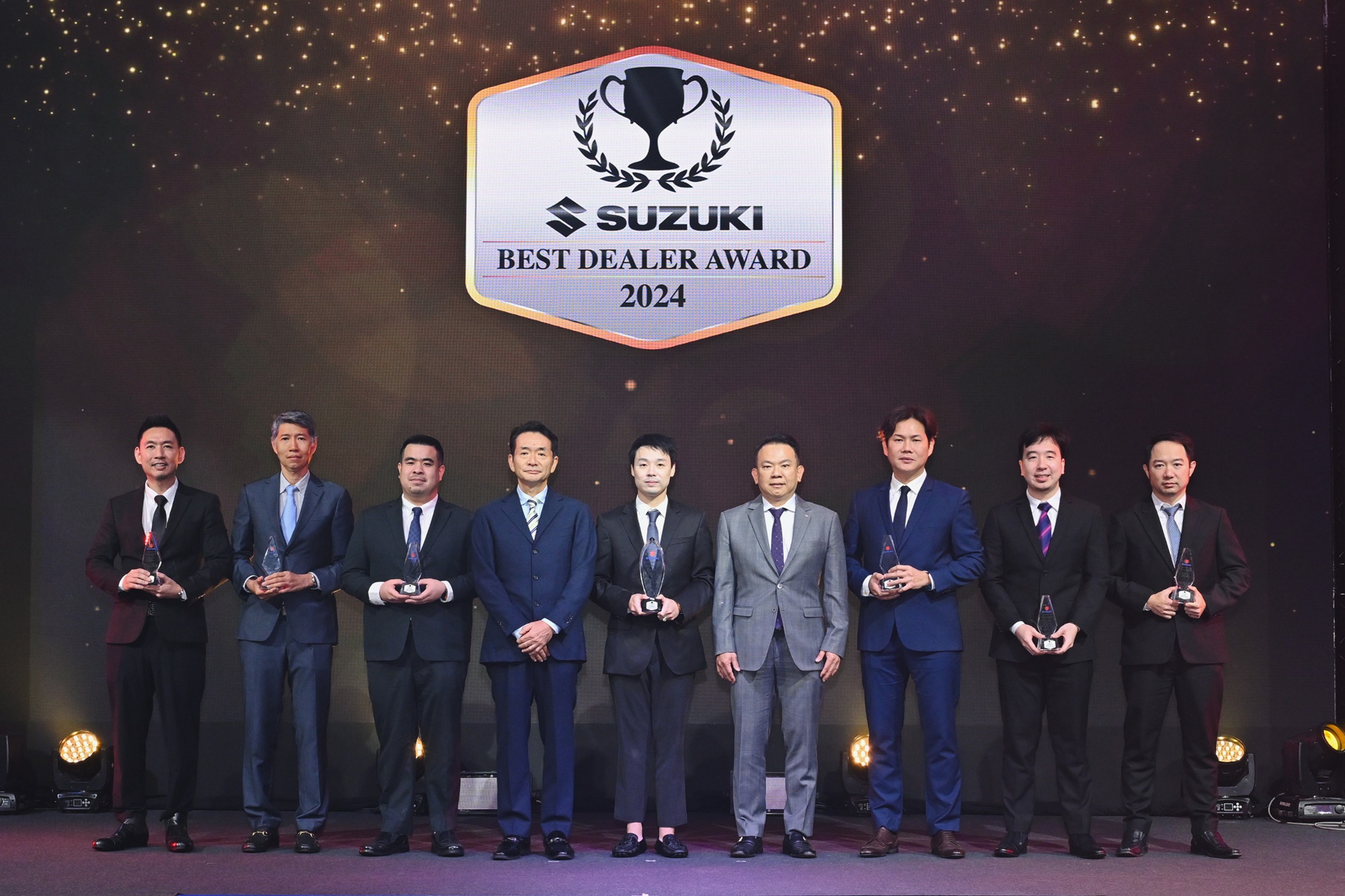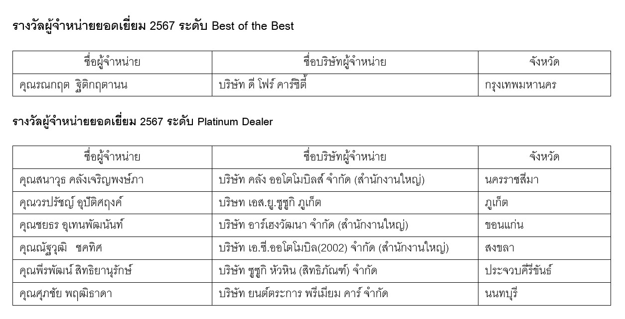 นอกจากการประกาศวิสัยทัศน์ในการดำเนินธุรกิจแล้ว ยังได้มีการจัดพิธีมอบรางวัลให้แก่ผู้ชนะในการแข่งขัน ‘SUZUKI Best Dealer Award 2024’ ซึ่งเป็นหนึ่งในแผนพัฒนางานบริการของผู้จำหน่าย ผ่านการจัดการแข่งขันผู้จำหน่ายยอดเยี่ยม ซึ่งจัดมาต่อเนื่องเป็นปีที่ 7 มุ่งหวังจะยกระดับมาตรฐานการดำเนินงานในทุกด้าน โดยมีรายชื่อผู้ได้รับรางวัล ดังนี้